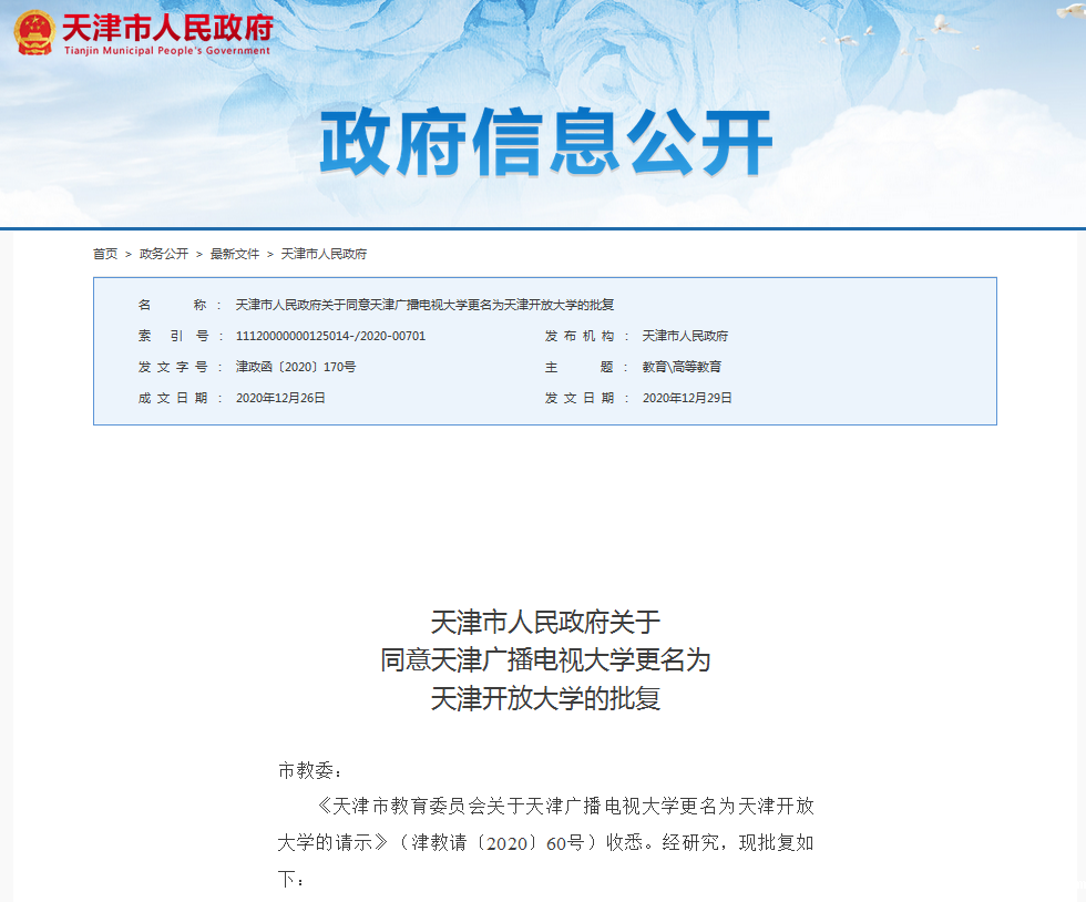 《天津市教育委员会关于天津广播电视大学更名为必威app登录官网下载苹果手机版安装的请示》(津教请〔2020〕60号)收悉。经研究,现批复如下: