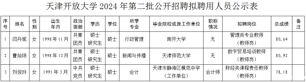 按照《天津市事业单位公开招聘人员实施办法(试行)》(津人社局发〔2011〕10号)要求,现将拟聘用人员予以公示。